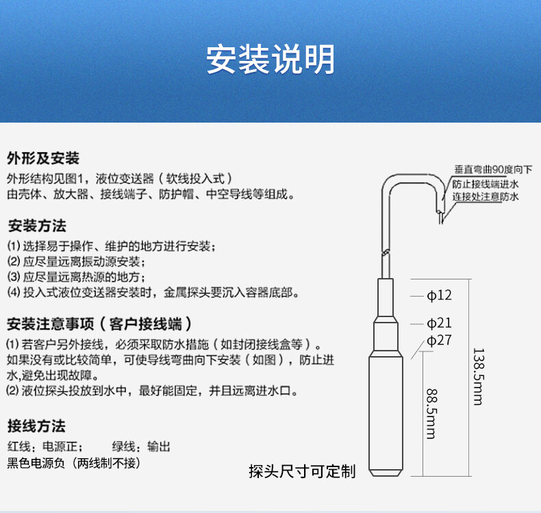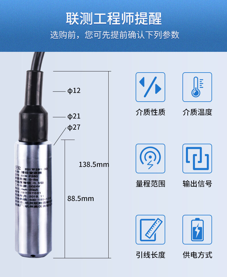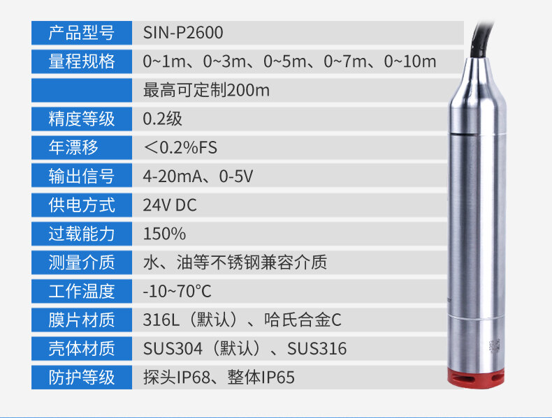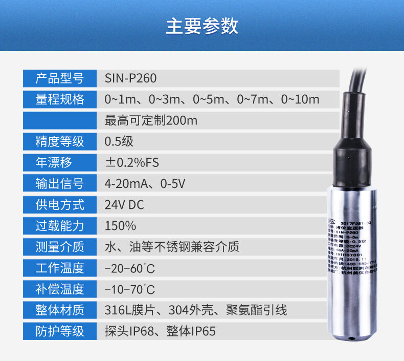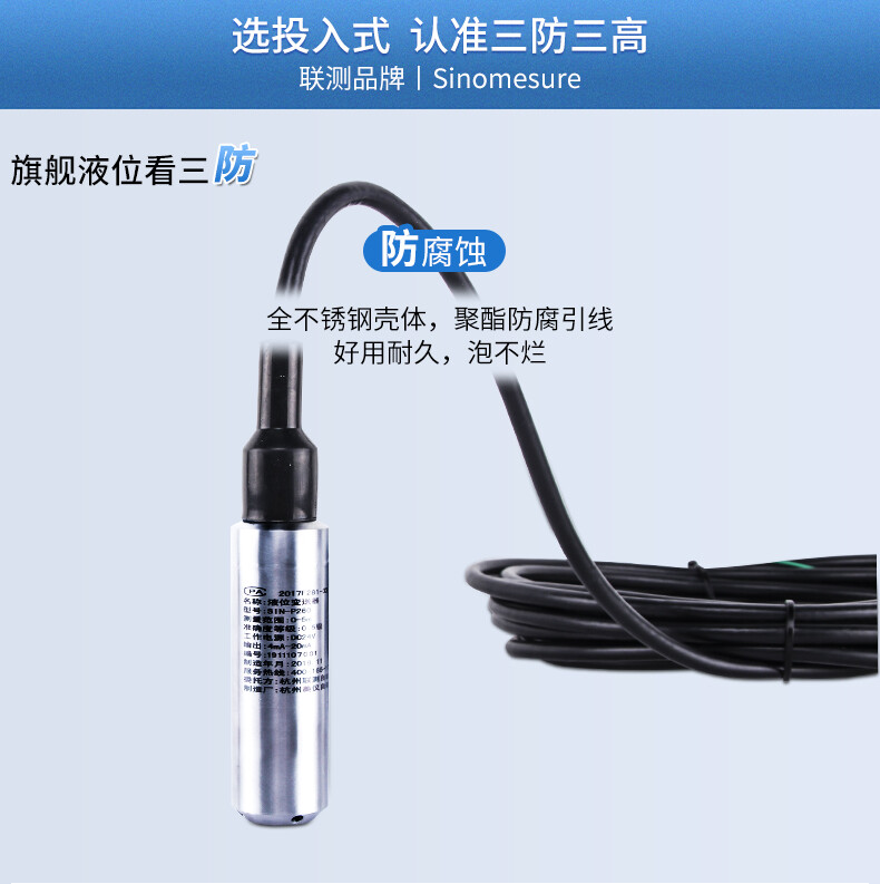 聯(lián)測SIN-P260投入式液位變送器由高性能擴散硅壓阻式壓力傳感器作為測量元件,把與液位深度成正比的液體靜壓力準確測量出來,并經(jīng)過信號調(diào)理電路轉(zhuǎn)換成標準(電流或電壓)信號輸出,建立起輸出信號與液體深度的線性對應關(guān)系,實現(xiàn)對液體深度的測量。